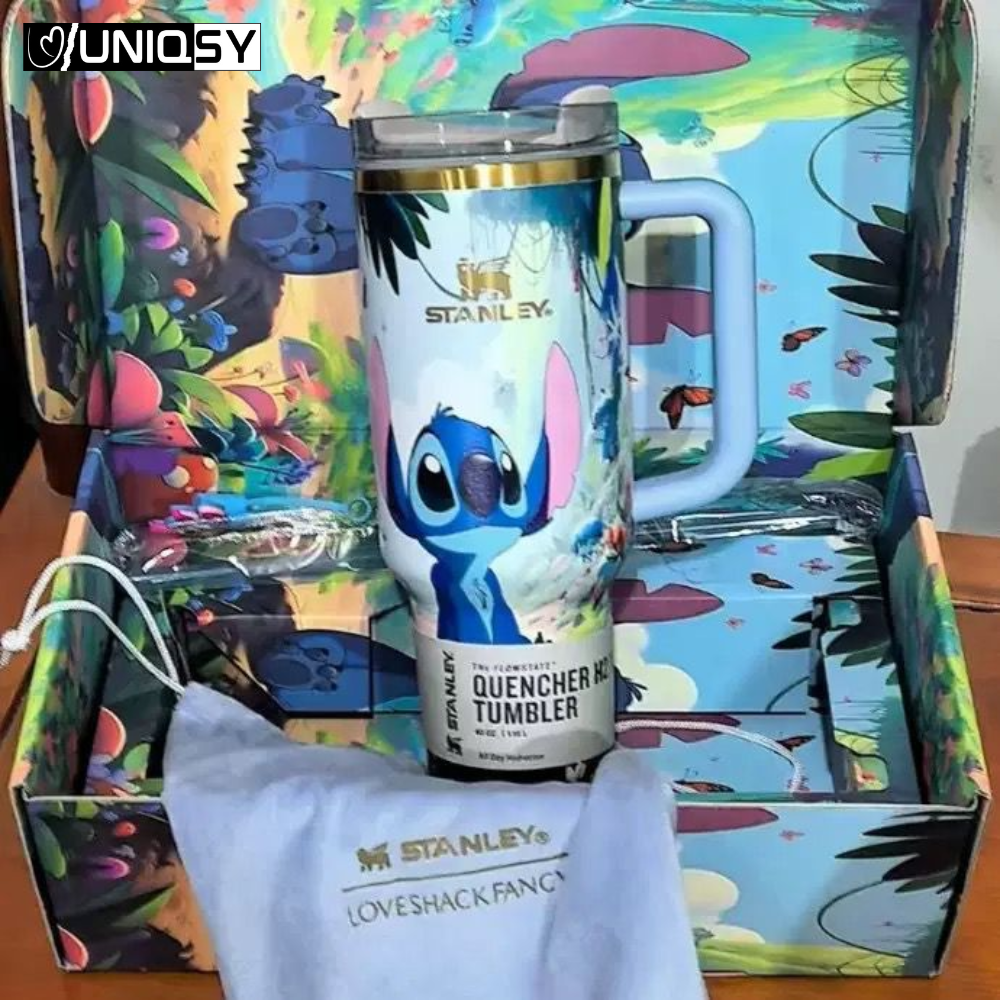 Experience the magic of hydration with the Stanley Stitch Blue 40 OZ Quencher Tumbler – Limited Edition, available exclusively at Uniqsy. Designed for fans who love a touch of personality in their drinkware, this stunning tumbler showcases the adorable Stitch surrounded by a lush, vibrant tropical scene.